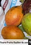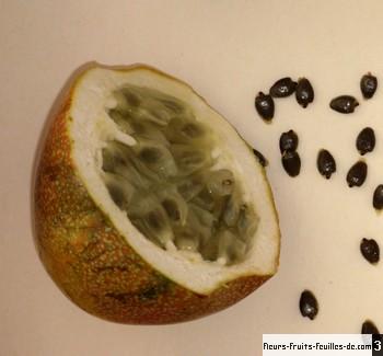 Description: fruit ressemblant au fruit de la passion mais ayant une peau de couleur jaune / orange (photo 1). Les fruits de la passion ont une couleur de peau rouge (photo 4 : grenadille à gauche et fruit de la passion à droite).