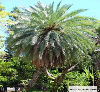 Description: Le dattier indien est un palmier à tronc mince et rugueux de 15-18 m de haut surmonté d'une couronne de feuilles pennees coriaces à pétiole armé d'épines orangées. Chaque feuille, gris-verte et mate, est arquée et mesure 4 m de long (photos 1 et 3). L'inflorescence est une gerbe plus ou moins dense de minuscules fleurs jaune pâle ou orangées. Celles-ci donnent des fruits oblongs charnus (photos 4 et 5), jaune orange a maturité, contenant une graine ovoïde dure.