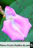 Description: Le pois sabre blanc est une plante herbacée grimpante annuelle ou un arbuste ligneux à croissance vigoureuse. Elle a des racines profondes, ce qui la rend résistante à la sécheresse. Les feuilles composées de trois folioles ovales sont acuminées à l'apex et mesurent 20 cm de long pour 10 cm de large (photo 4 et voir plus de photos). Ses fleurs possède un étendard rose à violet strié de blanc (photos 1, 3 et 5). Les graines blanches sont enfermées dans une gousse mesurant 15 à 35 cm de long. Chaque graine possède un hile brun.
