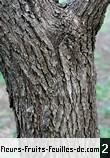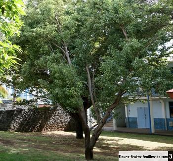 Description: Grand arbre au tronc vigoureux, souvent noueux, à la couronne largement déployée, pouvant atteindre plusieurs centaines d'années et prendre d'énormes proportions (30 mètres de hauteur) . Ecorce caractéristique permettant de bien reconnaître l'arbre: grise, rugueuse, épaisse et fissurée longitudinalement par endroits sur 5 à 6 cm. Feuillage persistant, coriace. Feuilles alternes (5 à 10 cm de long) à pétioles longs, lisses, ovoïdes-lancéolées et à limbe vert clair brillant, revers vert-bleu mat, souvent rougeâtres lorsqu'elles sont jeunes, dégageant une forte odeur de camphre lorsqu' elles sont froissées. Nervures secondaires bien visibles, souvent recourbées vers le haut. Panicules axillaires de fleurs très petites et simples, de couleur jauneâtre à blanc verdâtre, d'environ 5 à 7 cm de long. Les fruits sont de petites baies à une graine entourées d'une cupule (ovaire demi-infère), de 5 à 10 mm de diamètre, vertes et devenant noires lorsqu'elles sont mûres. L'arbre ne fructifie qu'à partir de sa vingtième année.