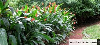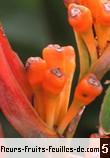 Description: Le bec de perroquet peut mesurer 1,20 m de haut (photo 4), ses feuilles peuvent faire entre 15 et 100 cm de long et 6 cm à 20 cm de large. Elles sont oblongues, vert foncé et coriaces. Les feuilles inférieures ont un long pétiole, les feuilles supérieures en sont presque dépourvues. Les fleurs sont dressées, mesurant 9 cm de long, et possédant de longues bractées de 3 à 15 cm, orange et généralement rouge au sommet (photos 1 et 3). Les fruits sont arrondis, 1 cm de large, jaunâtres à bleu foncé à maturité (photo 5). Ils contiennent 3 graines. Il existe de nombreux cultivars et hybrides de Heliconia psittacorum dont la couleur des bractées varie du jaune pâle au rose ou au rouge foncé.